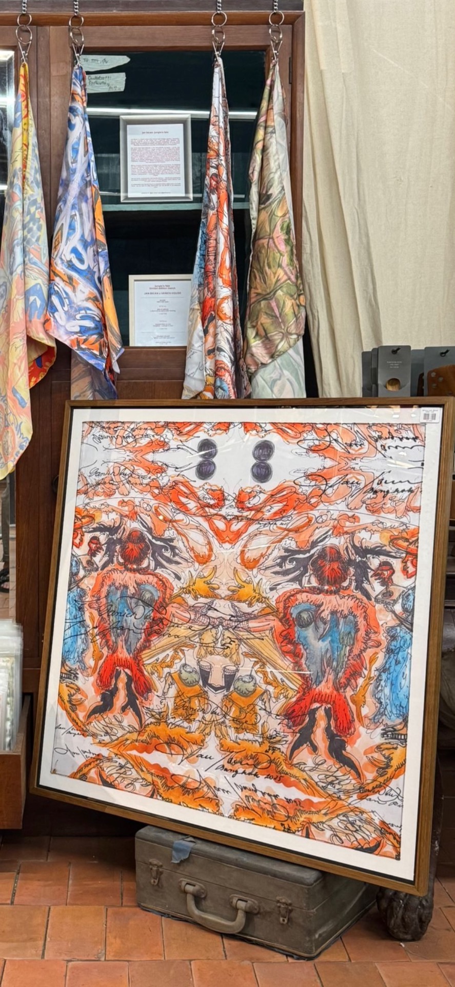 Šátek z hedvábného saténu s potiskem mé malby, ušitý v Thajsku z kvalitního hedvábí. Šátek vypadá skvěle kolem krku i na hlavě — a je to další krok k tomu, jak se z tohohle světa snažím dělat chodící galerii. Můžeš ho i zarámovat a udělat z něj statement kousek do bytu.