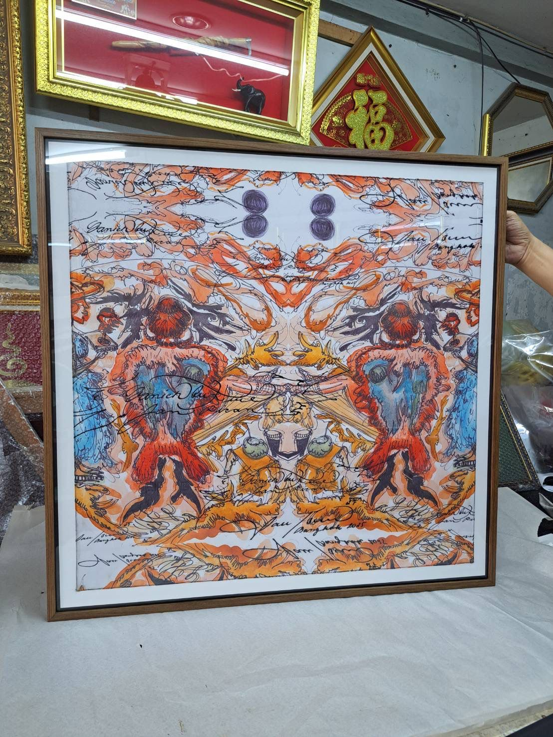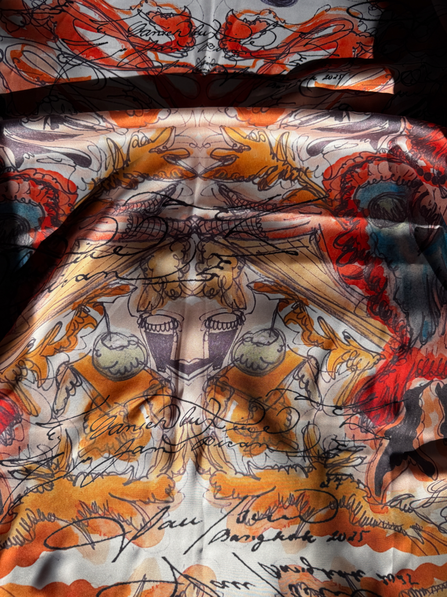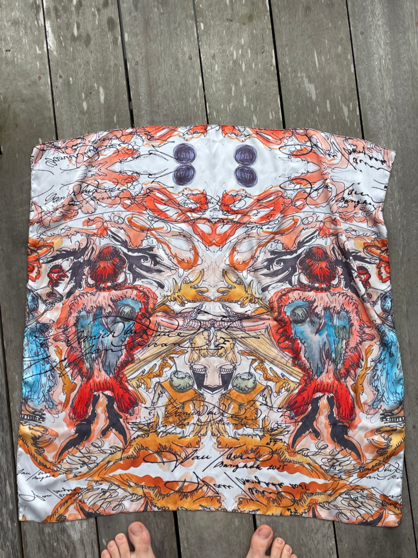Šátek z hedvábného saténu s potiskem mých maleb, vytvořeny v limitované edici ve spolupráci s Vanich House Bangkok (space, kde mě v lednu čeká už druhá výstava). Šátek vypadá skvěle kolem krku i na hlavě — a je to další krok k tomu, jak se z tohohle světa snažím dělat chodící galerii. Můžeš ho i zarámovat a udělat z něj statement kousek do bytu.