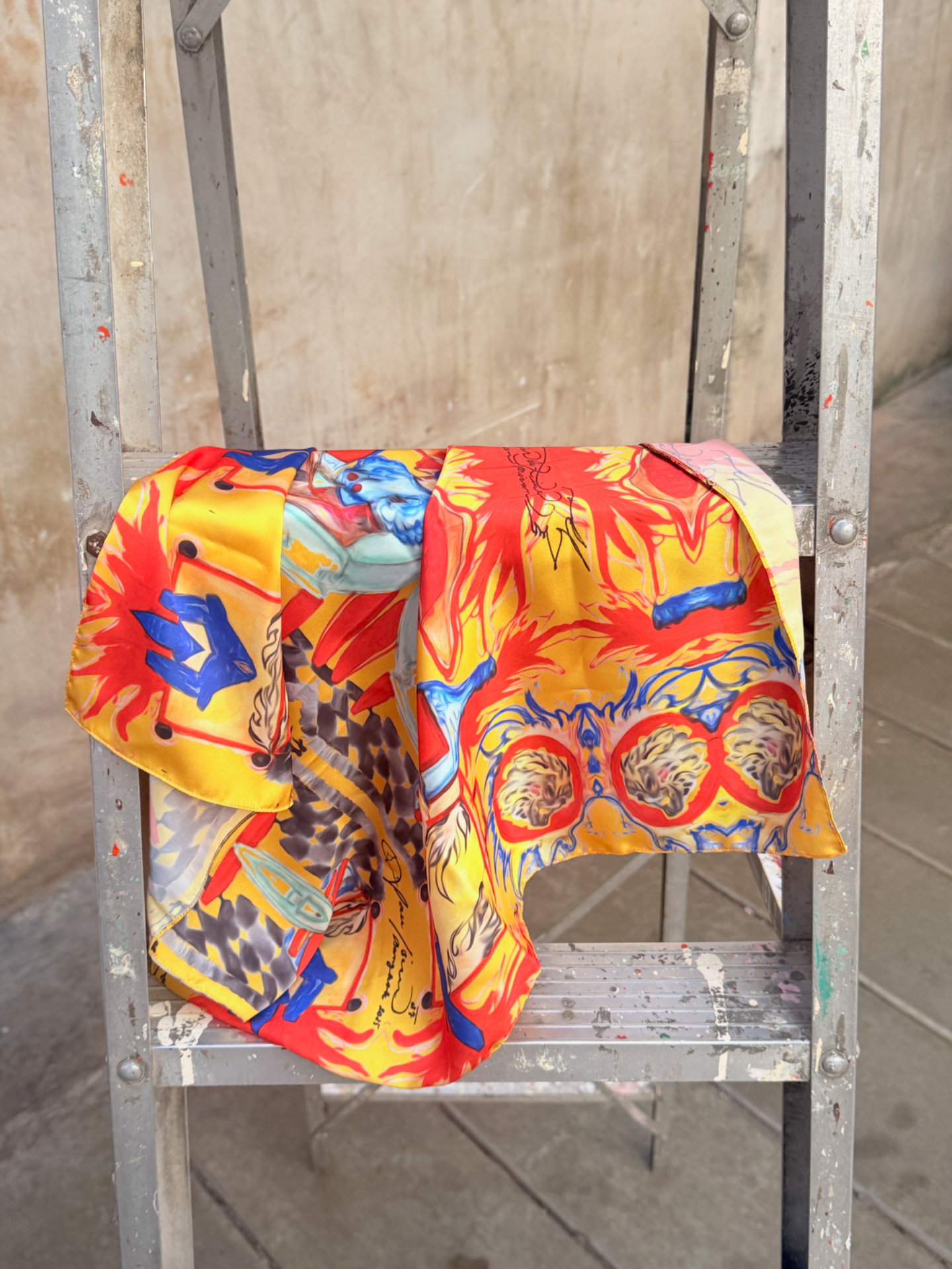 Šátek z hedvábného saténu s potiskem mých maleb, vytvořeny v limitované edici ve spolupráci s Vanich House Bangkok (space, kde mě v lednu čeká už druhá výstava). Šátek vypadá skvěle kolem krku i na hlavě — a je to další krok k tomu, jak se z tohohle světa snažím dělat chodící galerii. Můžeš ho i zarámovat a udělat z něj statement kousek do bytu.